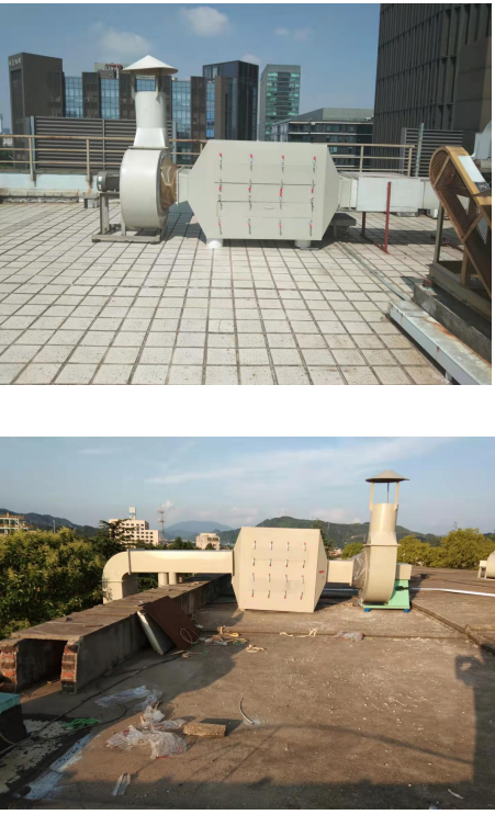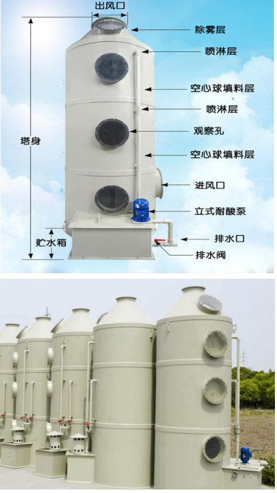 有机废气治理工艺比较吸收塔结构: 酸雾净化塔为圆筒型结构形式,全塔由三部份组成,即贮液、进气、喷淋、脱水和出气,耐酸水泵装在外侧,与塔进、出口管连接,塑料球分别装在喷淋内。喷淋吸收塔为PP或玻璃钢一体成型,结构紧凑,耐腐蚀,耐高温,外表光滑;除水部份:塑料制隔离式产生水气分离;喷水部:高压喷水产生雾状,分上下两段扩大接触处理提高功能;填充物:海胆型或皇冠型高性能填料,PP 质一体成型;循环水槽需有防溢水口,50mm 水位溢水排放管;观察窗:5mm厚透明压克力板制;自动加水装置:浮球液面自动控制式。